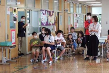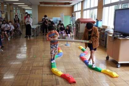 「みんななかよく みやマッチョ」の学習を行いました。二人組で協力しながら、ボールや棒を運んだりします。ペアの二人はもちろん一生懸命、見ているみんなも温かい声援を送りました。