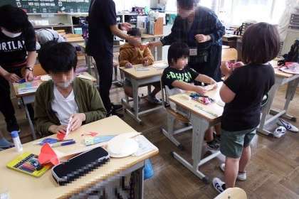 「あめだね あつまれかたつむり」の学習の様子です。紙皿や色紙を使い、6月にたくさん見られるかたつむりを作りました。みんなが作ったかたつむりが集まります。