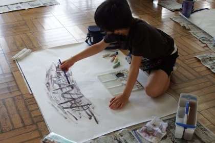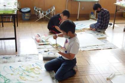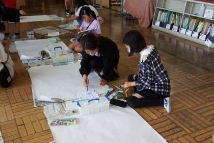 写真は、図工「心のもよう」の学習の様子です。大きな紙を使うため、教室や広場の床に広げて、おもいっきり描きました。みんな伸び伸びと筆を使うことができました。