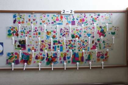 現在2年生の学年掲示板には、図工の時間に作成した「ひかりのプレゼント」の作品がズラリ。きれいに並べられた作品が、とても色鮮やかに見えます。写真は、1組と2組の作品です。