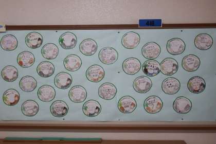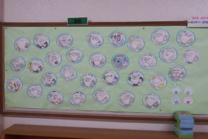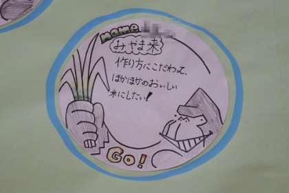 5年生は、総合的な学習で米づくりを行っています。5月の田植えから9月の収穫まで、米づくりに対しての意気込みが掲示板に貼られています。米づくりに対する子どもたちの思いが伝わってきます。