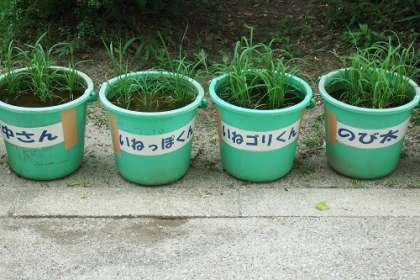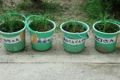 5年生が育てているバケツ稲。応募によってそれぞれにかわいいネームングができました。愛着が今まで以上に増してきたかな。
