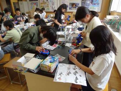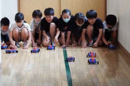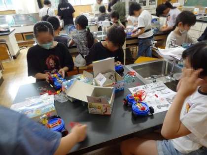 理科「電池のはたらき」の学習が進んでいます。実験でつかった器具をもとに、自分だけの自動車を作りました。みんなで走らせながら、競争です。とても楽しい時間を過ごしました。