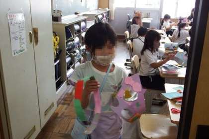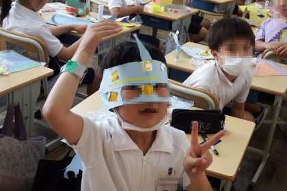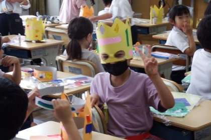 図工「わっかで へんしん」の作品が徐々に完成してきました。自分がつくった冠やお面をかぶって変身する子どもたち。心が躍ります。作品は、渡りに展示しています。