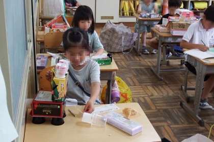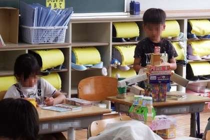 図工「はこでつくったよ」の取り組みの様子です。自分のもってきた箱から、どんな作品を作ろうかイメージします。ロボットやきりん、ドラゴンなど、子どもたちの発想は豊かです。