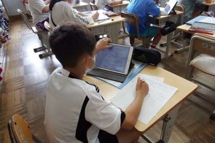 職員室の前で、バケツ稲がすくすくと育っています。この日は、稲の様子を観察した後、米作りについて、各自で調べ学習を行いました。これから暑い夏を迎えます。ますます成長してくれるとよいです。