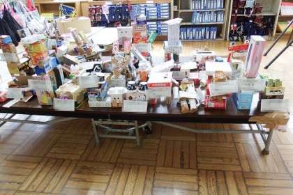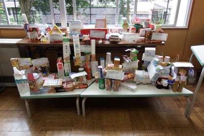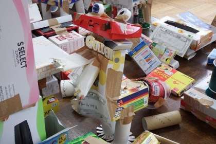 「はこでつくったよ!」で完成させた作品を広場に展示しています。犬や猫、ロボット、くまなど、子どもたちが工夫してつくりあげた楽しい作品がいっぱいです。