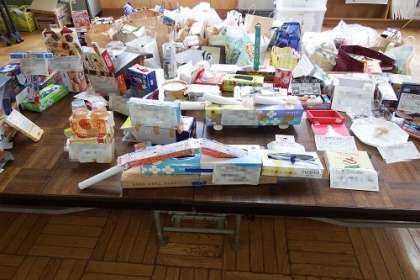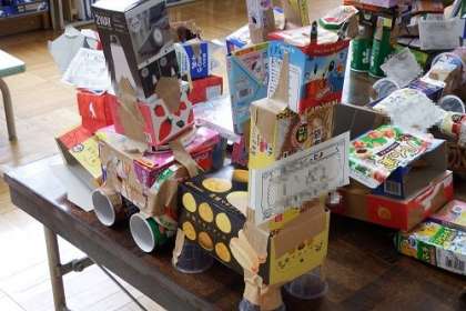 「はこでつくったよ!」で完成させた作品を広場に展示しています。犬や猫、ロボット、くまなど、子どもたちが工夫してつくりあげた楽しい作品がいっぱいです。