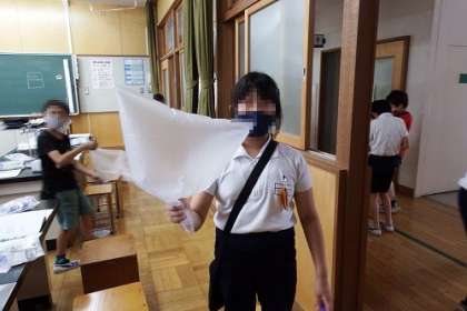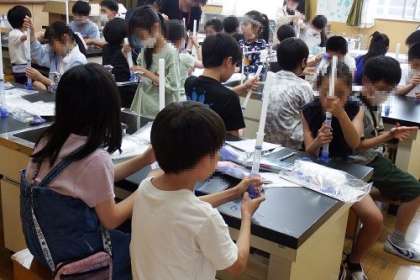 「とじこめた空気に力を加えると、空気の体積や手ごたえはどうなるのだろう」ビニール袋や注射器をつかって、手ごたえや体積の変化を実験で確かめました。
