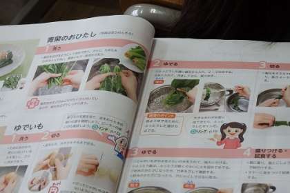 家庭科で調理実習を行います。作るのは「青菜のおひたし」です。この実習では、洗う、ゆでる、切るなどの基本を学びます。実習の日までに、しっかりと手順を学んで・・・。
