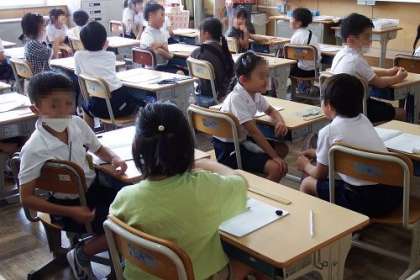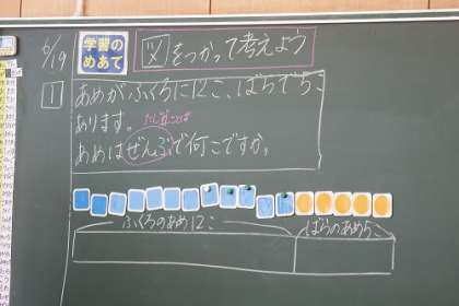写真は、算数「図をつかって考えよう」の学習の様子です。12個のあめと5個のあめ、全部で何個になるか考える問題です。数図ブロックから図を書いて求めるやり方を学習しました。