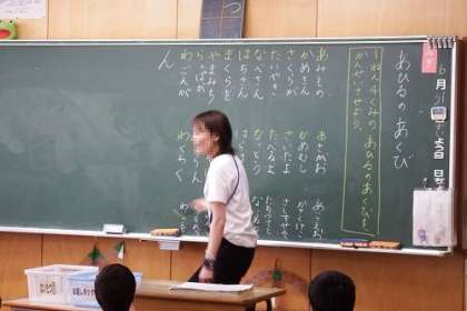 国語「あひるのあくび」で、ひらがな50音の学習を行いました。教科書のあひるのあくびをもとに、学級のあひるのあくびを作ります。あみもの あさがお あいうえお・・・。子どもたちの元気な声が教室に響きました。