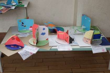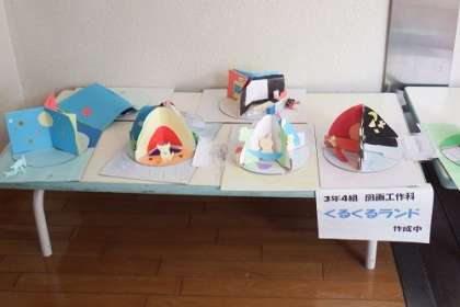 図工「くるくるランド」で子どもたちが作った作品を、2階渡りに展示中です。くるくる画用紙を回すことで、全く別の世界が出現します。