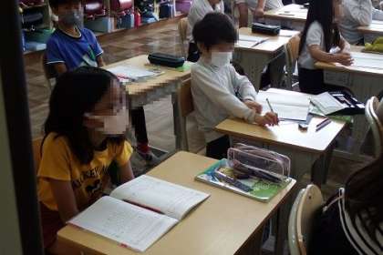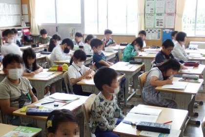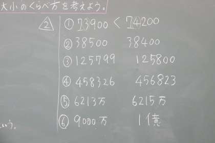 算数「一万をこえる数」の学習で、大きな数の大小の比べ方を考えました。大きな位の数を順番に比べていくと、大小が分かることに気づきました。大小を表す記号として、不等号を学習しました。