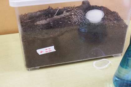 夏です。1年生の広場には・・・・カブトムシが。虫かごの中で育っています。昼は土に隠れてじっとしています。じっくりと観察する子どもたちもいます。