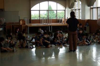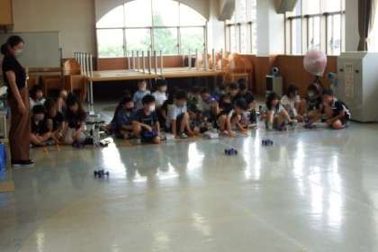 理科「ゴムや風の力」の学習でつくったゴムで動く車。ランチルームで走らせてみました。ゴムだけでどんどん進んでいく車をみて、応援したくなりました。
