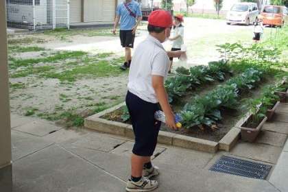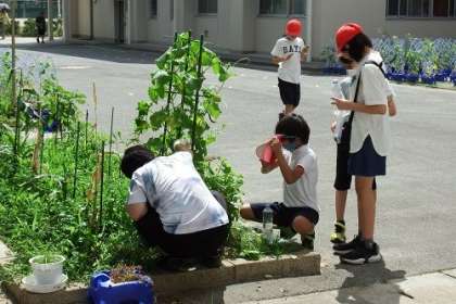 子どもたちにとって、野菜の世話は、毎日の仕事です。せっせと水をやりながら、「今日は実がついたよ」「今日は、つるが伸びてきたよ」と成長を楽しみにしています。虫をとったりすることも。
