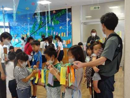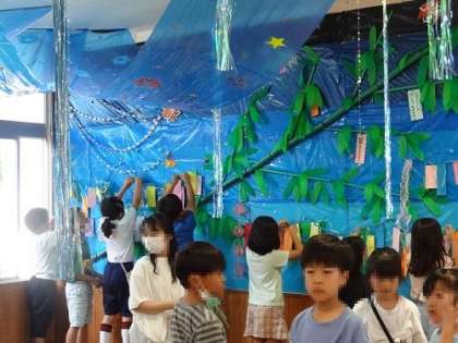 プチボラみやま隊の皆様が作成していただいた七夕。子どもたちが書いた短冊を飾り付けました。飾り付けには多くの子どもたちがお手伝いにきてくれました。素敵な七夕になりそうです。