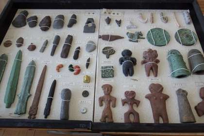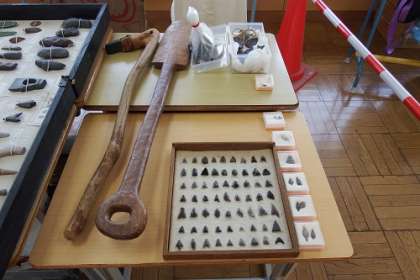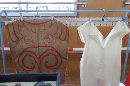 6年生が社会科で古代を学習しています。広場には、縄文時代や弥生時代の人々の服や矢じり、土偶などが置かれています。当時の人々の生活を考えるヒントになってくれれば。
