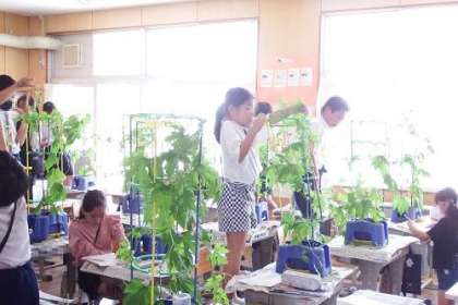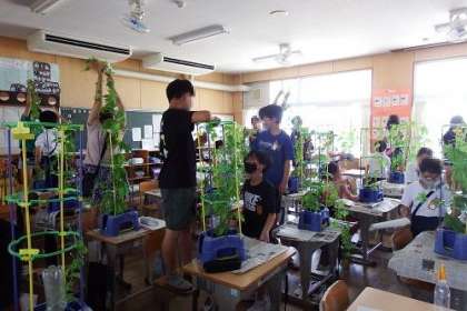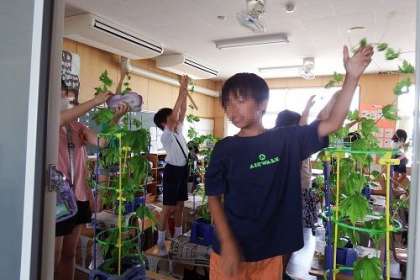 子どもたちが育てているツルレイシ。ぐんぐん成長しています。もう子どもたちの背丈を追い越してしまったものもたくさん。背伸びをしながら自分のツルレイシの高さをはかり、友達のものを比べっこです。