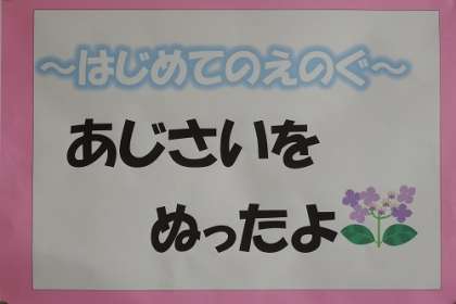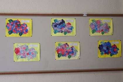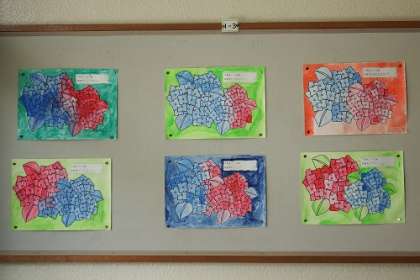 図工であじさいに色付けしました。作品が、教室や学年掲示板に掲示してあります。現在、夏季個別懇談会中です。学校にお越しの際は、ぜひ、作品を見ていってください。