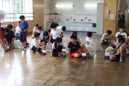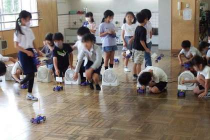 理科「ゴムや風の力」の学習を進めています。先日は、ゴムで動く車を作り実験を行いました。今回は、風で動く車です。送風機を使って後ろから風をあてます。勢いよく車が走り出します。