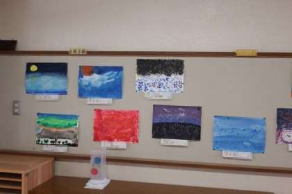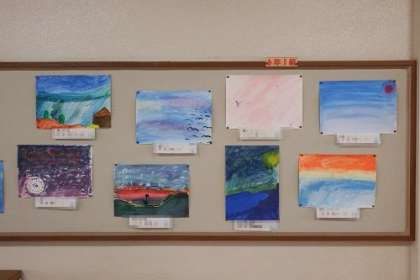 図工で取り組んだ空の様子を学年掲示板に掲示しました。空には様々な表情があります。また、書き手の意図や思いによっても表現が違ってきます。読書感想画に生かしていきます。