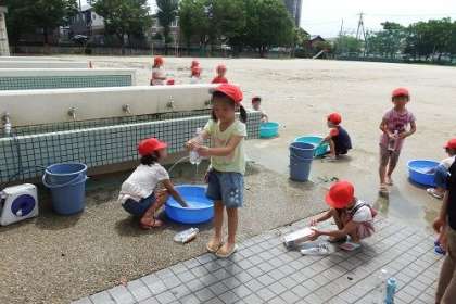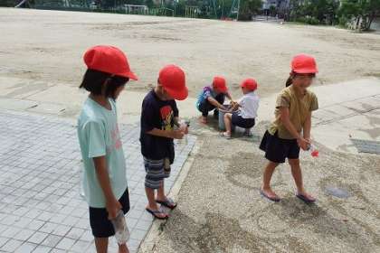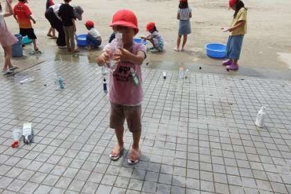 写真は、先週行った1年生の水遊びの様子です。子どもたちが持ってきたペットボトルに水を入れ、力をいれます。穴からいきおいよく水が噴き出します。水を使って字や絵をかく子もいます。