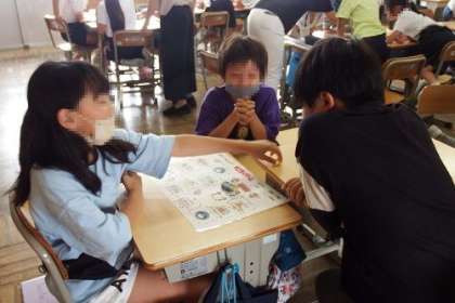 一日の生活の言い方を英語で表す学習に入りました。今日は言い方になれるために、スゴロクゲームを行いました。「Lunch Time」「Study Time」などの表現を知ることができました。