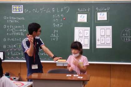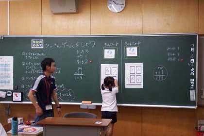 算数でひっ算の学習を行いました。ゲーム形式にして、ひっ算の問題を解決するために、グループごとで話し合います。正解だった時には、おもわずニッコリ。