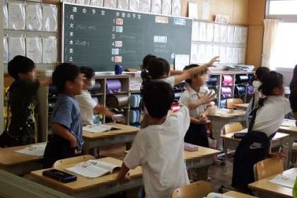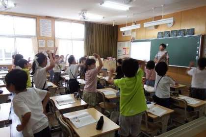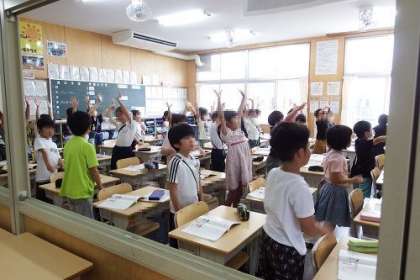 国語で詩「空にぐうんと手をのばせ」を学習しました。詩の情景をつかむために、みんなで朗読しながら、体を使って表現しました。「空にぐうんと手をのばせ わたぐも すじぐも かきわけて でっかいおひさま つかまえろ・・・」