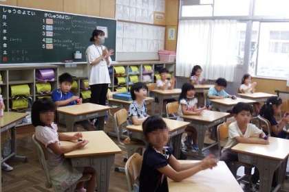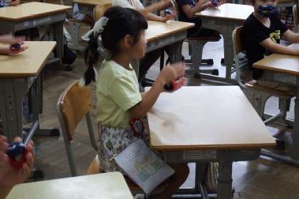「カスタネットは、指の腹で」カスタネットを使ってリズム打ちの学習を行いました。「さんぽ」や「白くまのジェンカ」をリズムにあわせて演奏しました。