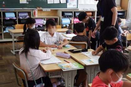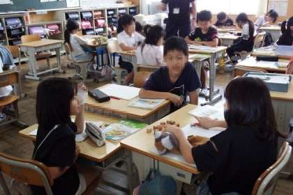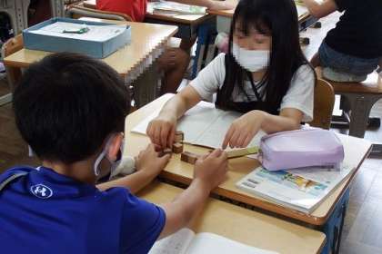算数「あまりのあるわり算」の学習に入りました。この日は、まず、あめの代りに、ブロックを操作して、答えに迫りました。その後、ブロックを使わない方法について考えました。