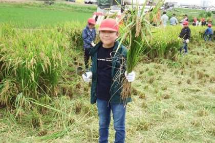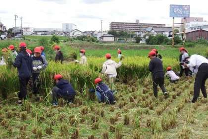 農事組合法人逢妻 あいち豊田農協豊田営農センターの皆様のお力をお借りして、5年生全員で稲刈りをしました。5月田植えをした稲には、稲穂がびっしり。子どもたちは、鎌を手に、稲を刈り取っていきました。美山米がたくさんできそうです。9月のキャンプで食べたり、ボランティアの皆様にお渡ししたりする予定です。