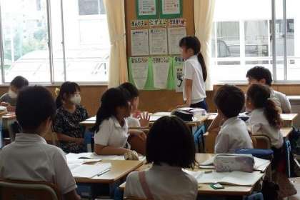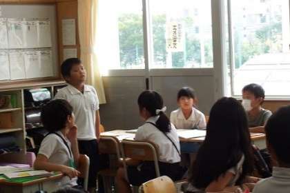 国語「グループの合い言葉をきめよう」の学習で、グループごとに話し合いをしました。なかなか話がまとまらないグループには、話をまとめるとめのコツが他のグループから出されました。こうして話し合いの仕方を学んでいきます。