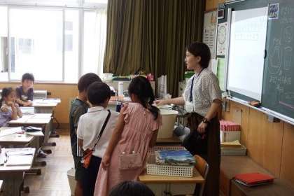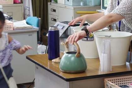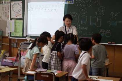 算数「おおきさくらべ」で、「かさくらべ」をしました。形が違う入れ物のかさを比べるためにはどうしたらよいのでしょう。同じ大きさのコップに水を入れかえたら、分かるかな。