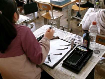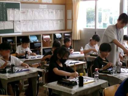 この日の書写のめあては、「はらいに気をつけて書こう」です。右はらいや左はらい、それぞれやり方が違います。穂先の動きを気をつけながら、何度も練習を繰り返しました。