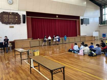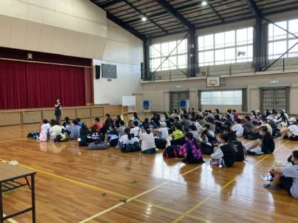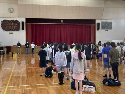 いよいよ修学旅行が、始まります。体育館で出発式を行いました。今日は、快晴。楽しい修学旅行になりそうです。