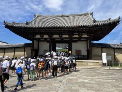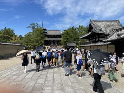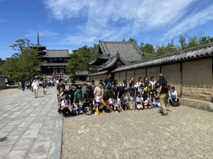法隆寺に着きました。門の向こうに大きな五重の塔が見えます。学級写真をパシャリ!
