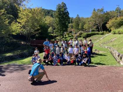 出会いの広場で学級写真をパシャリ。空は、雲一つない快晴です。写真は、1組と2組です。