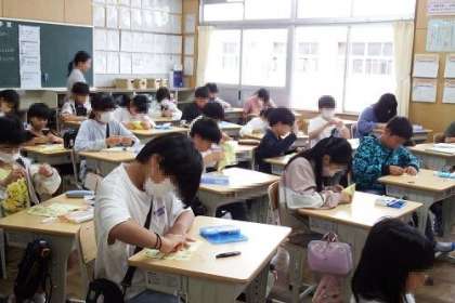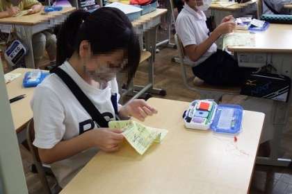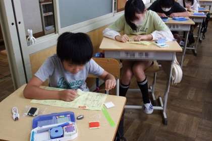 今日の課題は、「針に糸を通して、いろいろな方法でぬってみよう」です。なみ縫いや本返し縫い、半返し縫いなどを練習しました。みんな黙々と集中して取り組んでいました。
