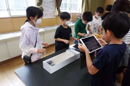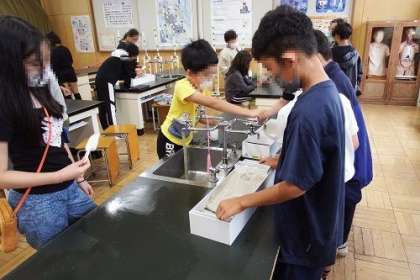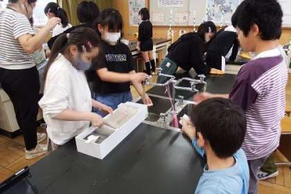 理科「流れる水のはたらきと土地の変化」の学習に入りました。この日は、流れる水には、どのようなはたらきがあるのか、実験によって確かめました。水を流すと土や砂が運ばれる様子がよく分かりました。