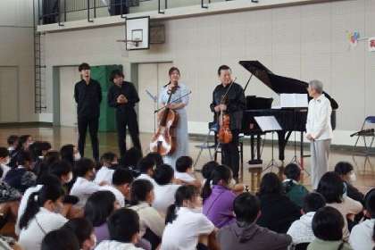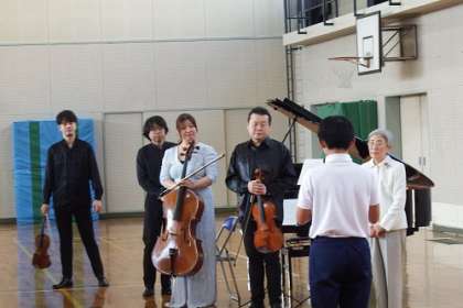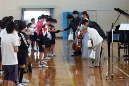 アンコールでは、演奏楽器にあわせて編曲した校歌を披露していただきました。弦楽器とピアノが奏でる素敵な校歌に感動しました。最後に、児童代表がお礼の言葉を述べて、音楽会を閉じました。