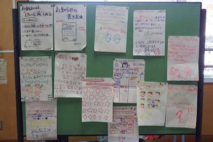 3年生は、会社活動に継続して取り組んでいます。どんな活動をしたら、みんなが楽しく学校生活を送れるのか、協力し合い工夫しながら頑張っています。写真は、掲示板によるお知らせの様子です。