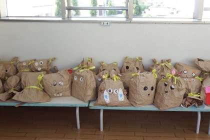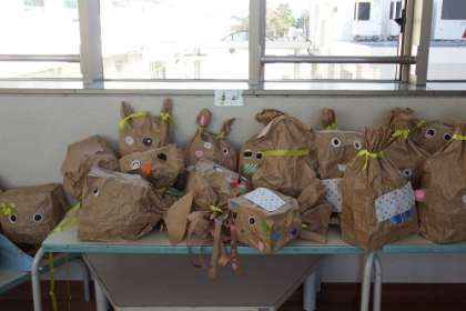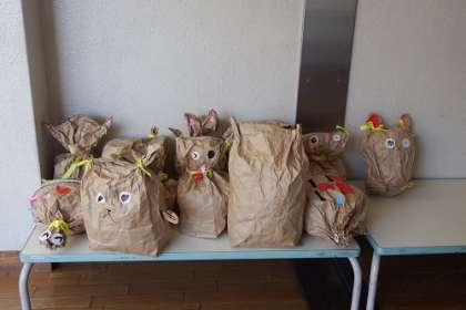 普段物を入れている紙袋が、あら、変身。可愛い動物に変わりました。ひもで縛ったり、リボンで飾ったり、紙袋にしわをつけたり、一つ一つ個性的な作品できました。