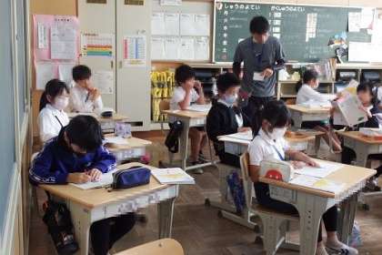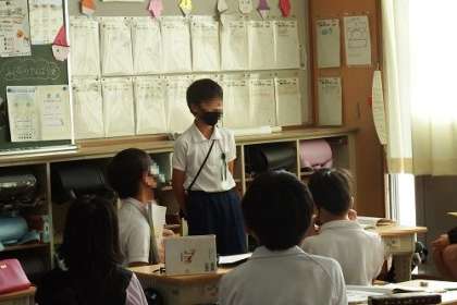 写真は、国語「くわしく表す言葉」の学習の様子です。主語と述語を確かめたあと、「何を」「何に」「いつ」「どこで」などの様子をくわしく表す言葉について考えました。