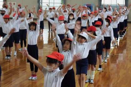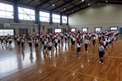 運動会の練習は、体育館でも。元気の子どもたちの声やリズムにのって踏み鳴らす足音が体育館中に響きます。