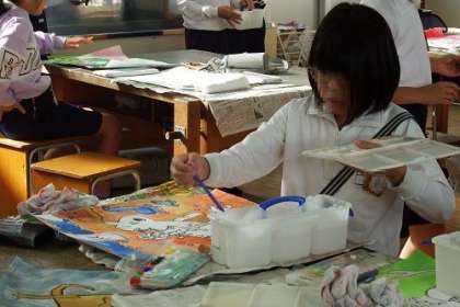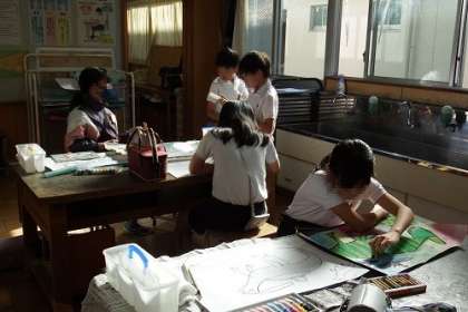 4年生は、読書感想画「ぼくが恐竜だった時」に取り組んでいます。大きく強そうな恐竜が画面いっぱいに描かれ、その迫力が伝わってきます。最後まで、粘り強く描き上げようと頑張る子がいっぱいです。