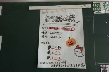 イベントママさんによる「折り紙の秋」実施中です。今週は、火曜日に実施されました。次は、来週の火曜日です。カボチャやオバケ、トトロができるようです。楽しみです。
