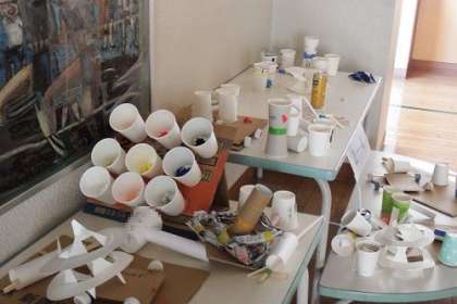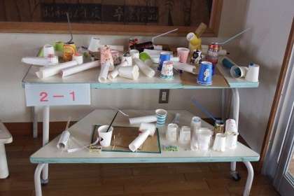 「おもちゃ教室」の準備が着々と進んでいます。この日は、グループで作るおもちゃを決めました。1年生の子は、喜んでくれるでしょうか。試作品が、いっぱい展示されています。